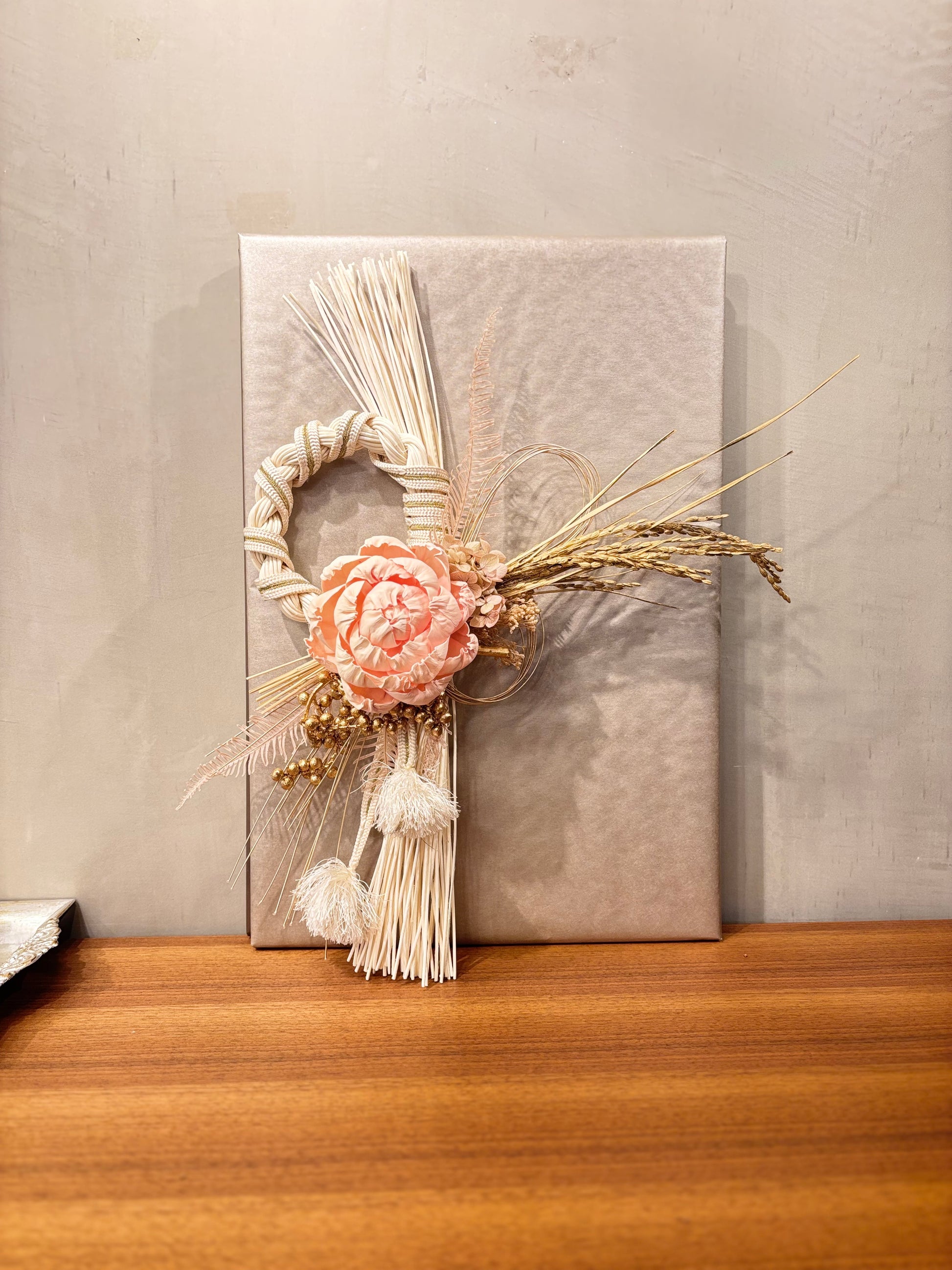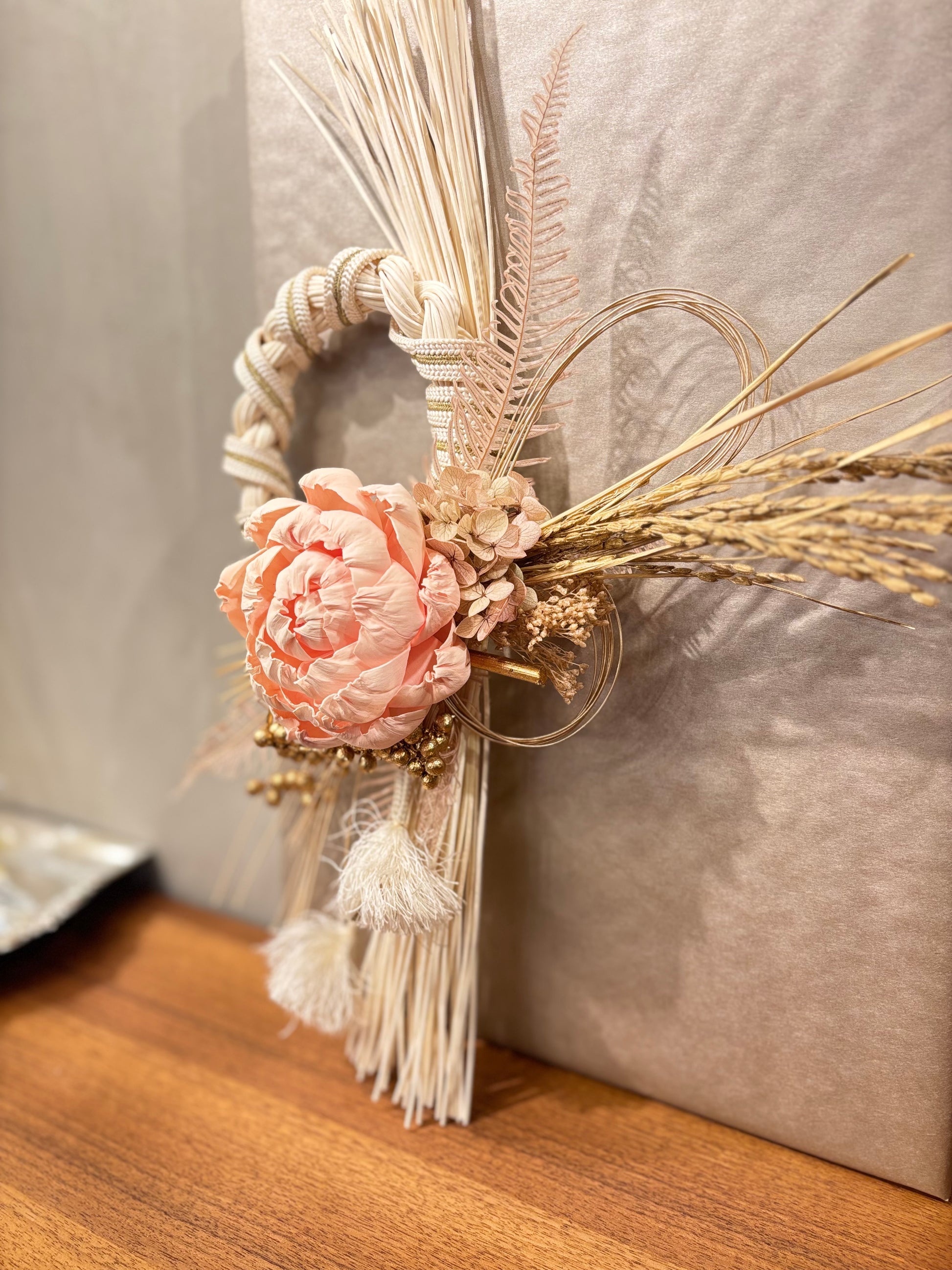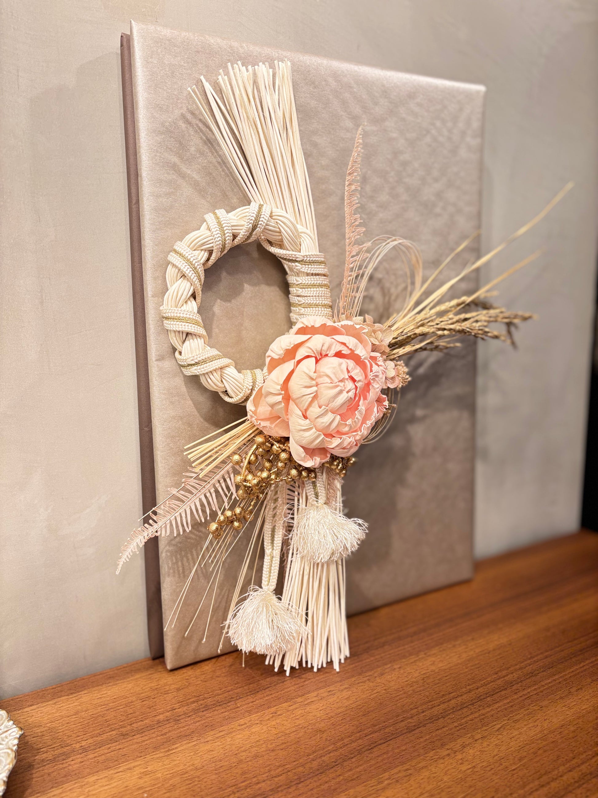 やさしいピンクの花がふんわりと映える、上品で個性的なしめ縄です。